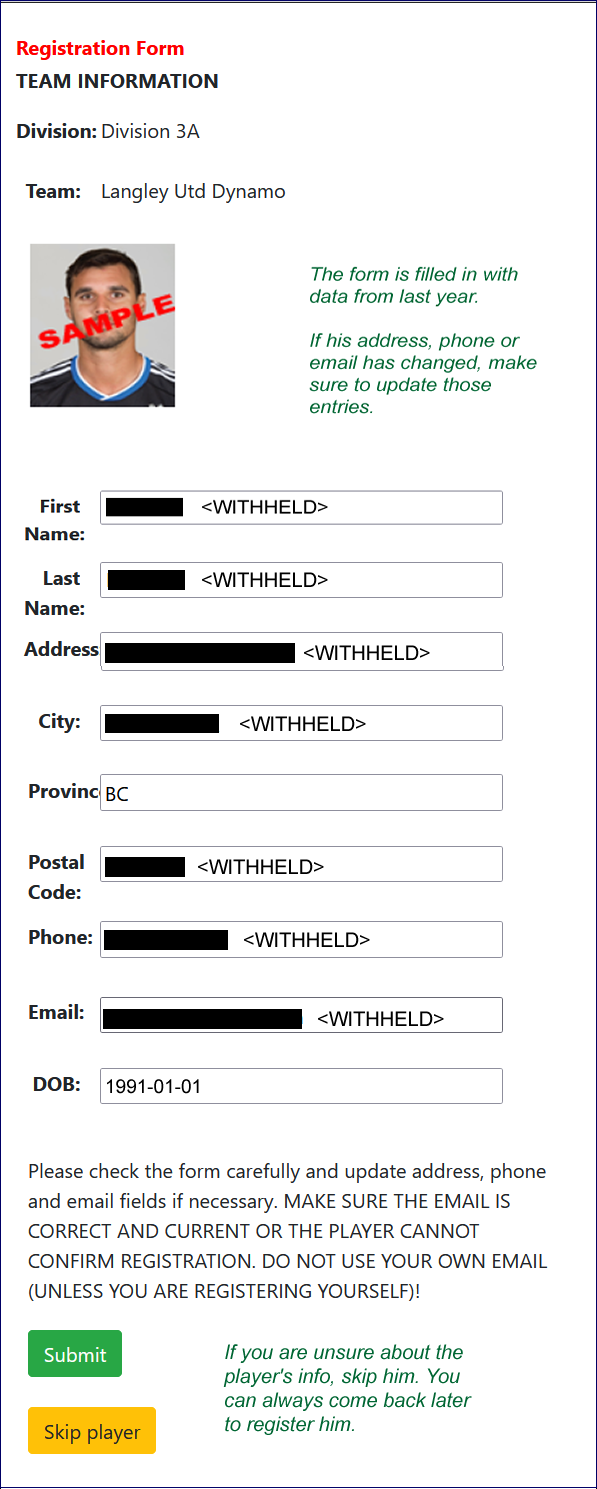 ON SUBMIT, YOU ARE SHOWN PERSONAL INFO ON EACH PLAYER. MAKE SURE IT IS ACCURATE BEFORE SUBMITTING.